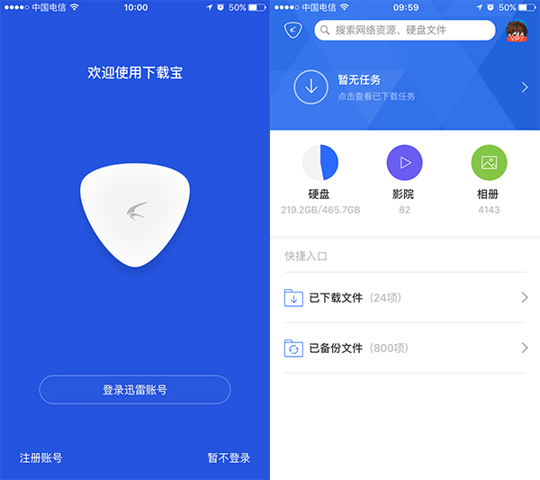 值得一提的是,迅雷下载宝是针对迅雷钻石会员用户打造,功能上只有钻石会员可以享受到离线加速和高速通道的下载加成。不过即使不是钻石会员,下载宝依然可以用来下载文件,只不过下载速度并没有那么快而已。而且下载宝的网络存储和文件分享功能是可以无限使用的,单就这个功能而言下载宝都称得上是一款值得入手的产品。