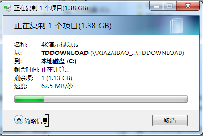 上图是PC端通过网线直接从下载宝拷贝文件的实时网速(读取),可以看到传输速度达到了62.5MB/秒,一部2GB左右的影片只需要二十秒左右就可以拷贝到PC硬盘中。实际上绝大多数情况下都可以双击打开下载宝中的视频文件直接观看,根本不用担心缓冲的问题。