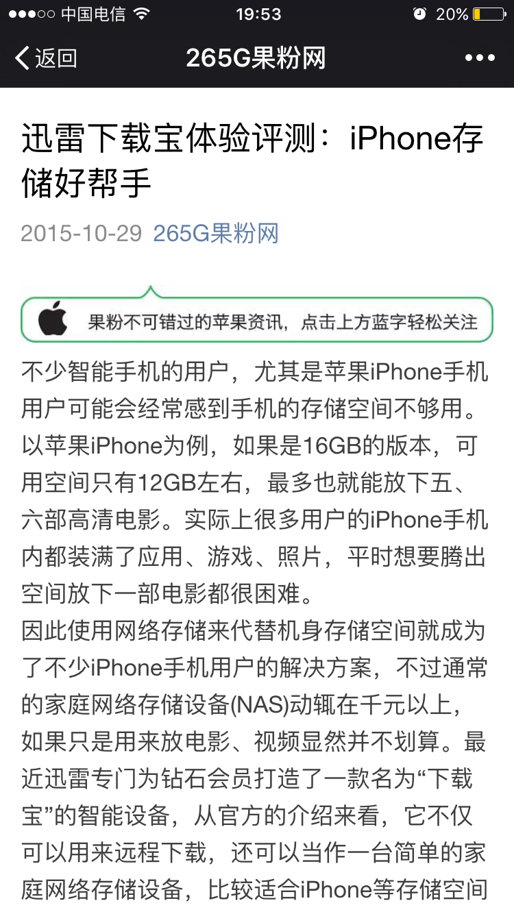 因此使用网络存储来代替机身存储空间就成为了不少iPhone手机用户的解决方案,不过通常的家庭网络存储设备(NAS)动辄在千元以上,如果只是用来放电影、视频显然并不划算。最近迅雷专门为钻石会员打造了一款名为“下载宝”的智能设备,从官方的介绍来看,它不仅可以用来远程下载,还可以当作一台简单的家庭网络存储设备,比较适合iPhone等存储空间不足的手机用户使用。